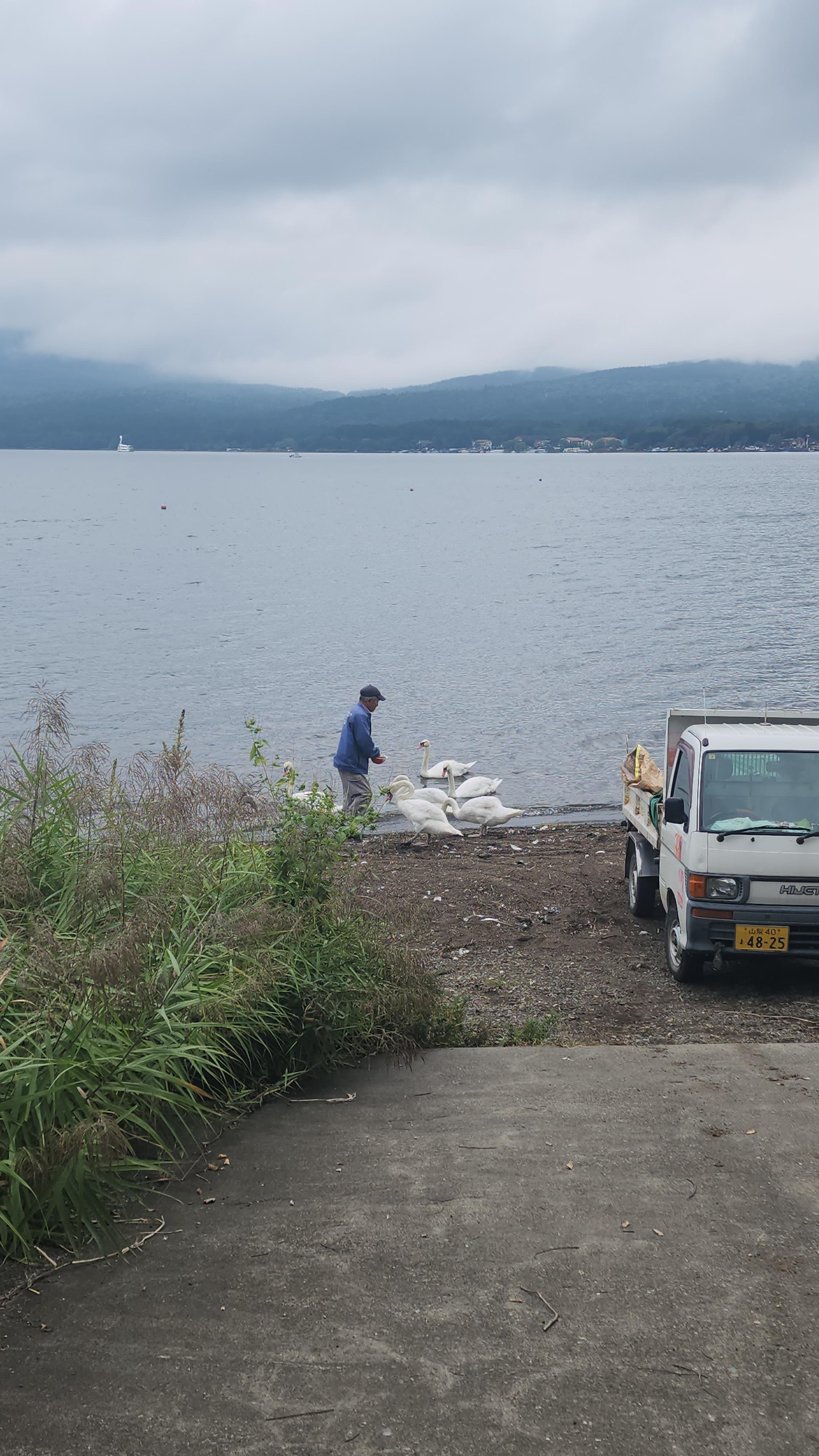 점심을 먹고 조금 지나 야마나카 호수에 도착했습니다. 사진은 흐려서 안보이지만 뒤의 산등성이가 후지산입니다 ㅎㅎ. 호수에는 패들보트를 즐기는 사람들이 있었습니다.